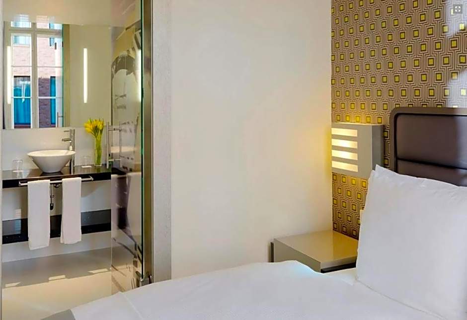 Spacious and quiet room with elegant design featuring modern comforts. The room has either a double bed or a twin bed.